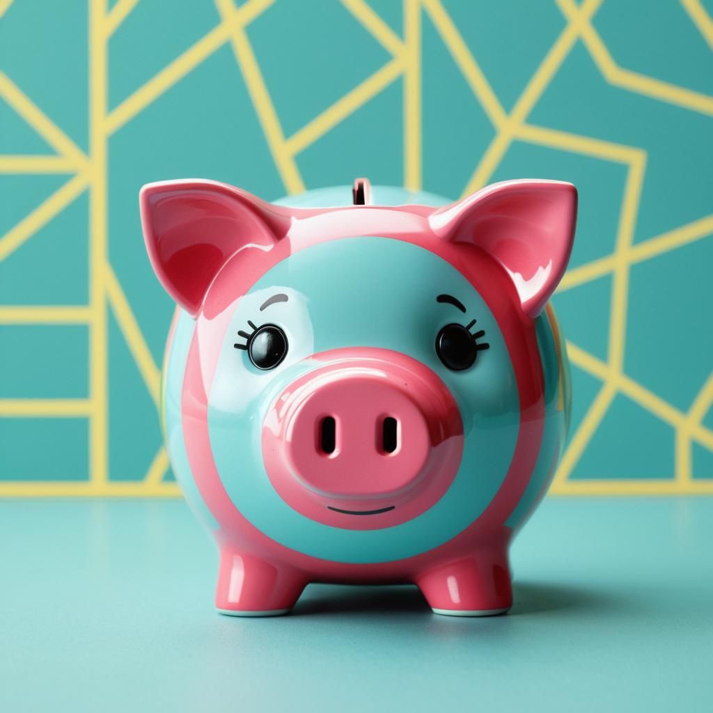 A small ceramic piggy bank designed with a colorful artistic pattern in bright pink and light blue. The piggy bank features a friendly face with cartoonish eyes and a smiling expression. It is positioned against a vibrant turquoise background with a yellow geometric pattern, reflecting a modern industrial design style.