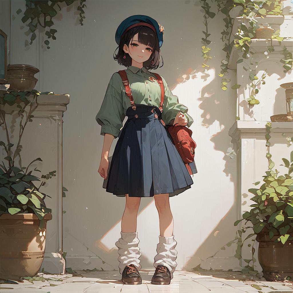 Illustration of an anime-style young girl standing indoors, wearing a blue beret, a light green buttoned shirt with rolled-up sleeves, a navy pleated skirt with suspenders, loose white socks, and brown shoes. The girl holds a small red bag and smiles gently. The setting features soft natural light and surrounding potted plants with trailing vines.