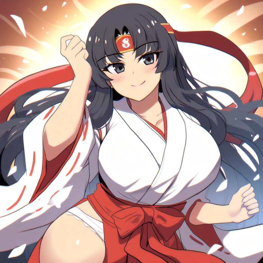 Digital anime-style drawing of a confident, fair-skinned woman with long, dark blue hair and large blue eyes. She wears a white kimono with red trim, a red obi belt, and a red forehead ornament with a white symbol. Her kimono is slightly open, revealing white underwear. She has a slight smile and is raising her right fist in a dynamic pose. The background is a bright, radiant burst of yellow and orange light with red and white petals floating around. The overall style is vibrant and energetic, with bold lines and vivid colors.