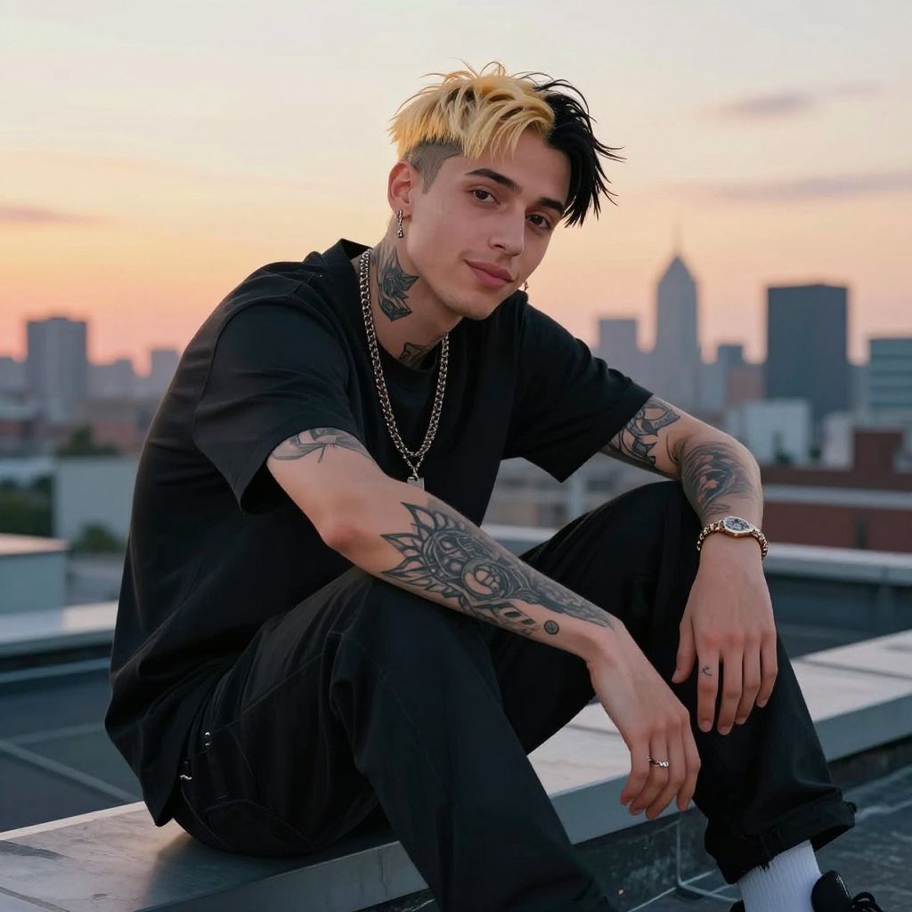 Lil Peep blonde and black hair, grunge aesthetic, moody urban background, soft neon lights, detailed facial tattoos, melancholic expression, streetwear fashion, vibrant yet dark color palette, cinematic lighting, realistic digital art.