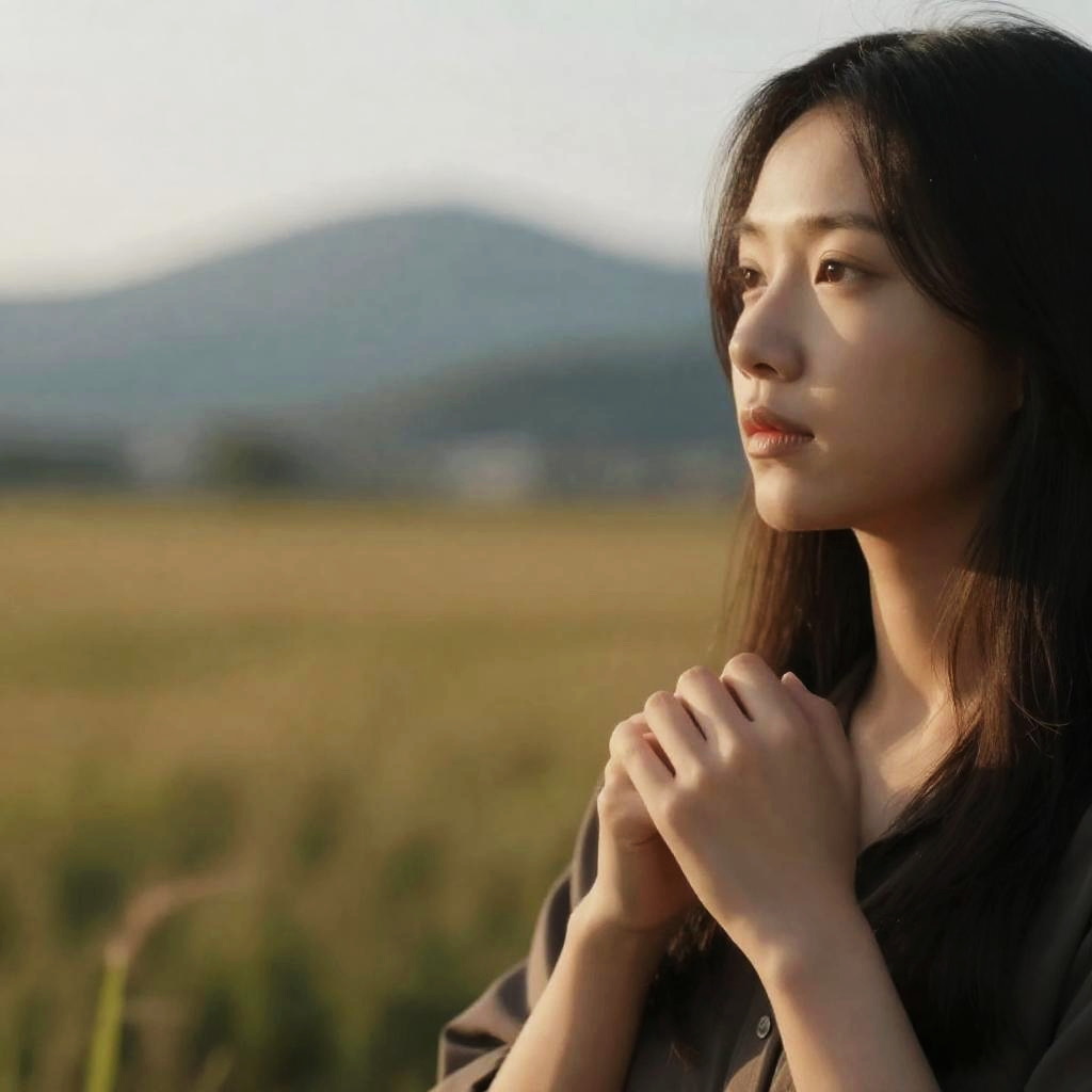 A serene and dreamlike photography series featuring a lone woman in a mountainous landscape. The images use a soft, muted color palette with tones of cool blue and capture an ethereal, cinematic quality. The lone woman is positioned in contemplative poses, surrounded by elements like rolling sand dunes and sparse shrubs. The background features a shallow depth of field with a gentle bokeh effect, adding a soft blur that enhances the dreamlike atmosphere. Lighting is soft, with natural sunlight or diffused light casting a nostalgic glow, evoking a feeling of peace and introspection. The overall mood is calm, with an emphasis on tranquility and connection with nature.