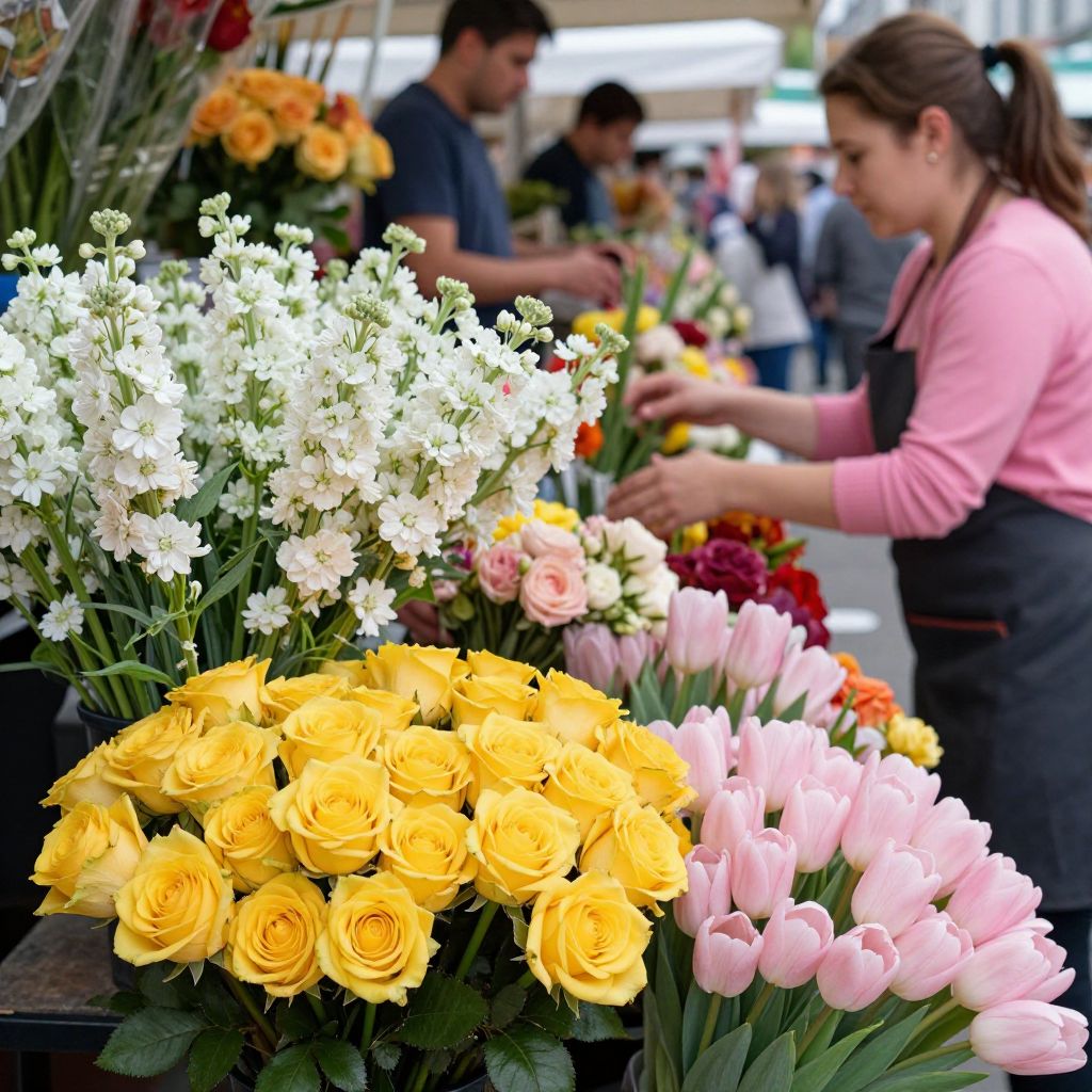 Vibrant bouquets of fresh-cut flowers, including bright yellow roses, delicate white blossoms, and soft pink tulips, are artfully arranged in rows at an outdoor market, with a woman in a pink shirt tending to them while a man browses in the background.