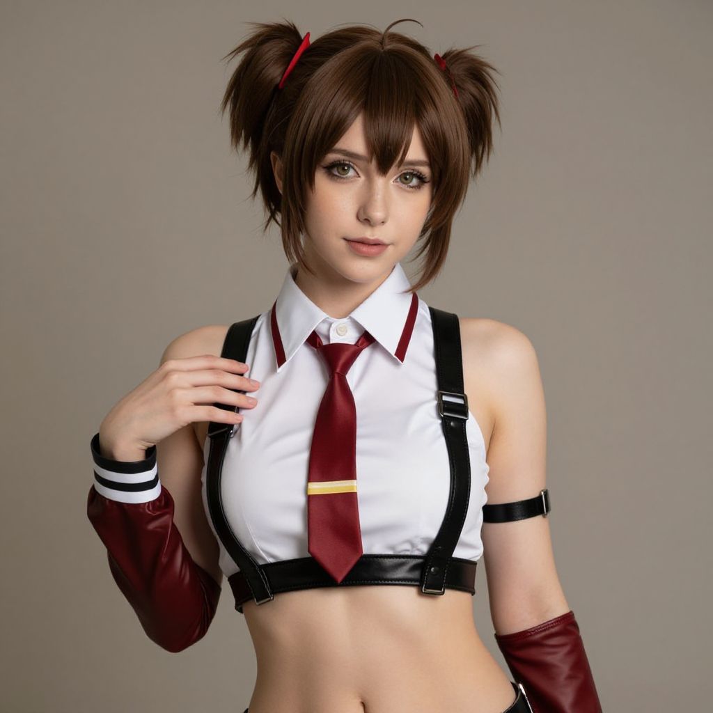 Photograph-style CGI of a young woman with brown pigtails, wearing a white sleeveless shirt, red tie, black suspenders, and red