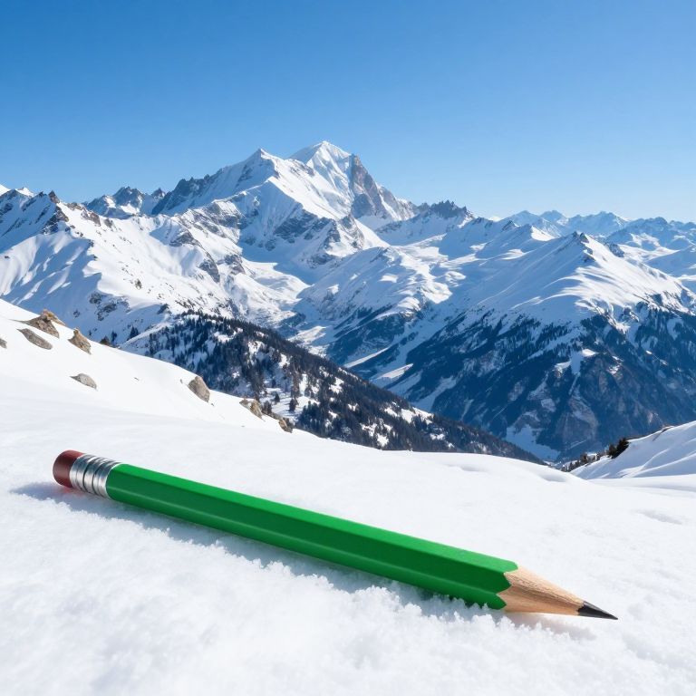 Photograph of a green pencil with a sharpened wooden tip, lying flat on a snowy mountain slope. The pencil's silver ferrule is visible at the top. Behind the pencil, a stunning mountain range with snow-covered peaks stretches into the clear, bright blue sky. The sunlight casts crisp shadows, highlighting the textures of the snow and the rugged mountain surfaces. The contrast between the vibrant green pencil and the white snow, along with the majestic blue sky and mountains, creates a striking visual composition.