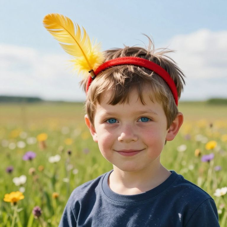 Boy in Sunny Meadow with Red Feather