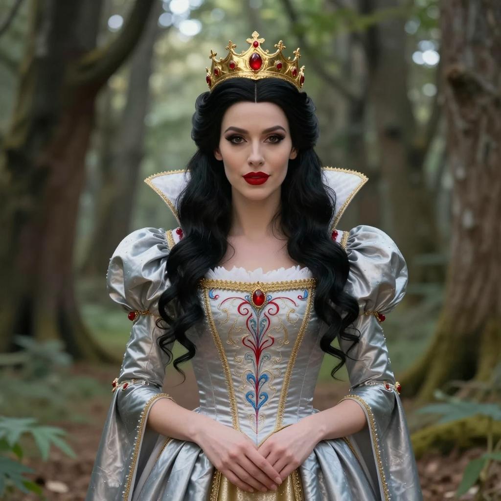 Magician dance costume, photorealistic, beautiful woman, fantasy dress, crown, forest background, sunlight, blue and red dress, gold trim, holding skirt, long wavy brown hair, serious expression, palm trees, lush greenery, detailed ures, digital art, elegant, mystical atmosphere