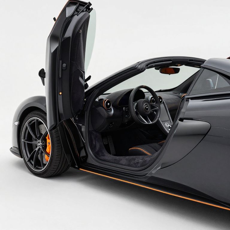 Open door of a 2015 McLaren 650S Spider Convertible reveals its sleek black interior and orange accents, showcasing the iconic design and engineering of this luxury sports car.