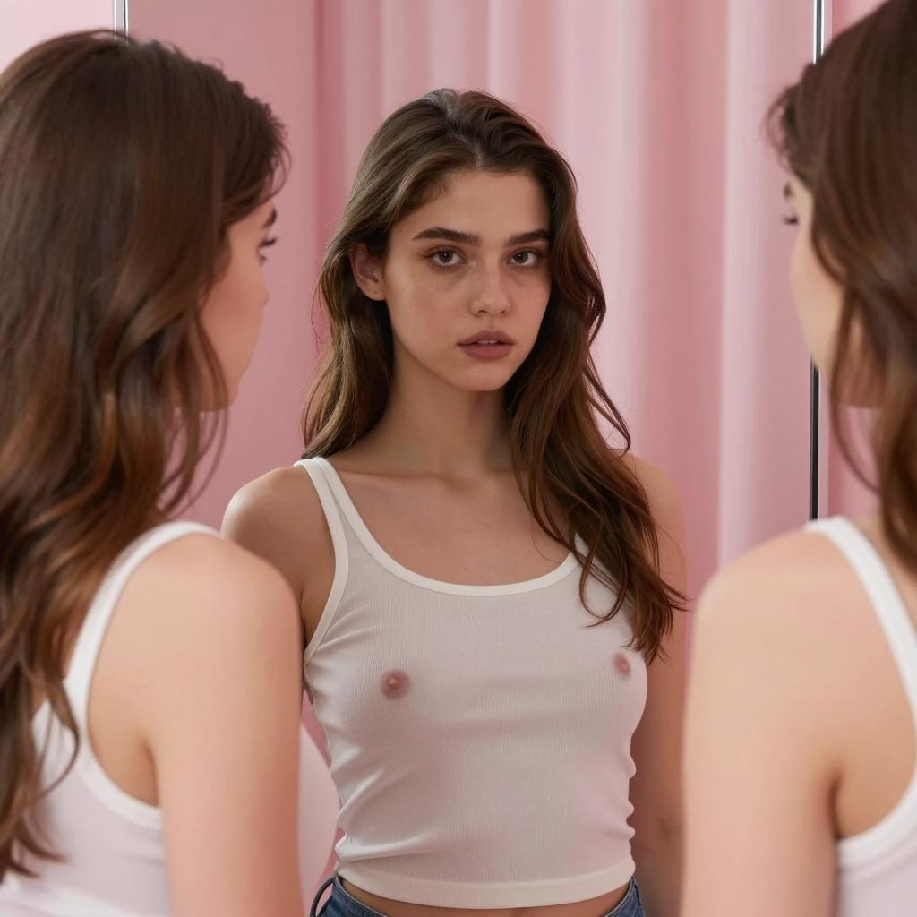 Woman with long brown hair, wearing a black halter top and black pants, sitting on a white bathroom sink. Large silver hoop earrings. Reflection in mirror shows side profile. Right arm extended forward, left arm resting on sink. White wall, closed blinds in background. Small gray bag and white cup on sink. Dim lighting.