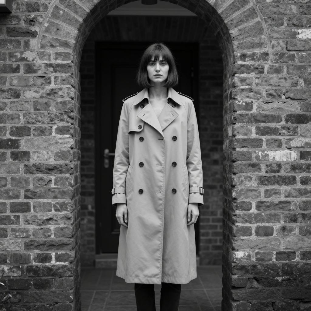 Black and white photograph of a woman with long blonde hair, wearing a denim jacket, folding a quilt. She is in the foreground, slightly to the right. A man with curly hair, wearing a loose coat and sandals, stands in the background, near an open door on the left. The setting is an industrial-style room with visible pipes and a ured wall.