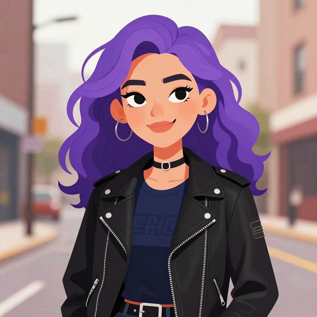 Digital drawing of a smiling woman with purple wavy hair, black leather jacket, choker, and hoop earrings, standing on a blurred urban street.
