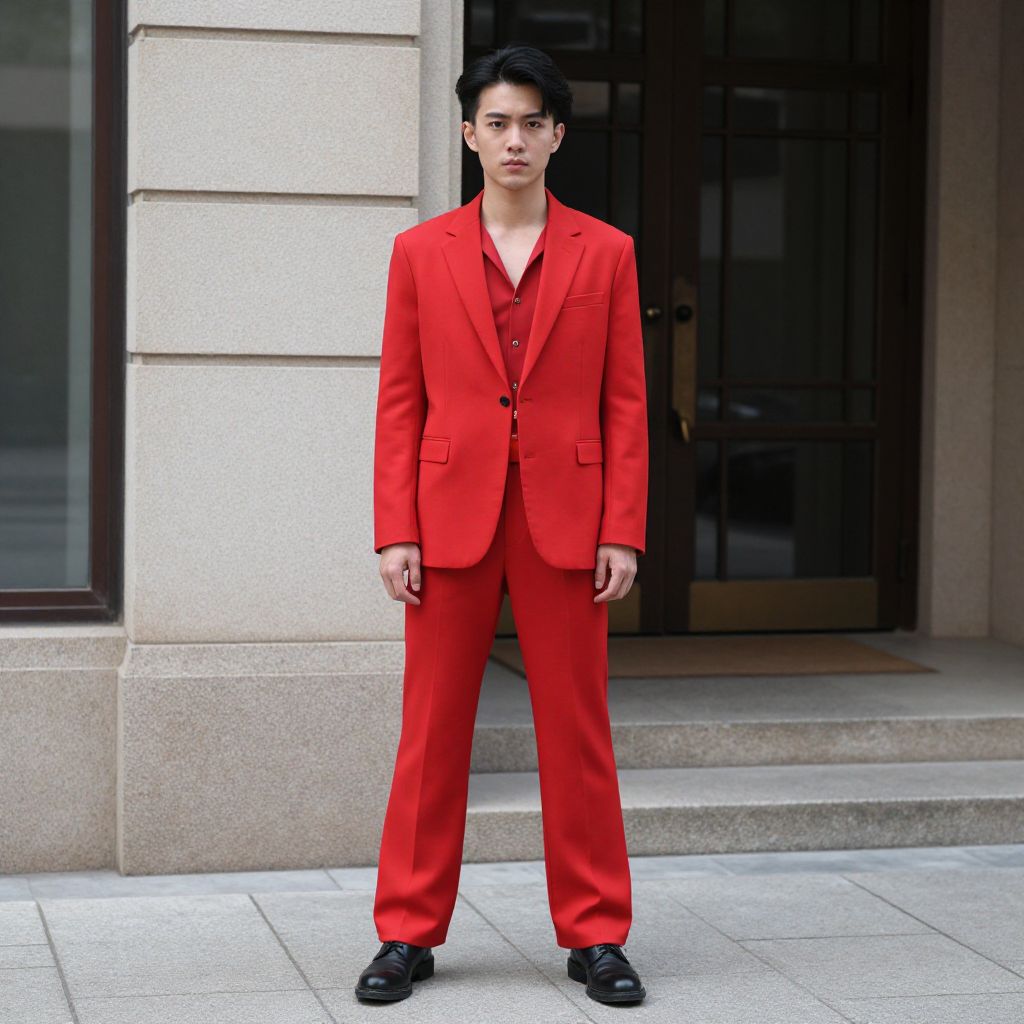 Red Fancy Dress Costume, asian man in red outfit standing on sidewalk in front of building