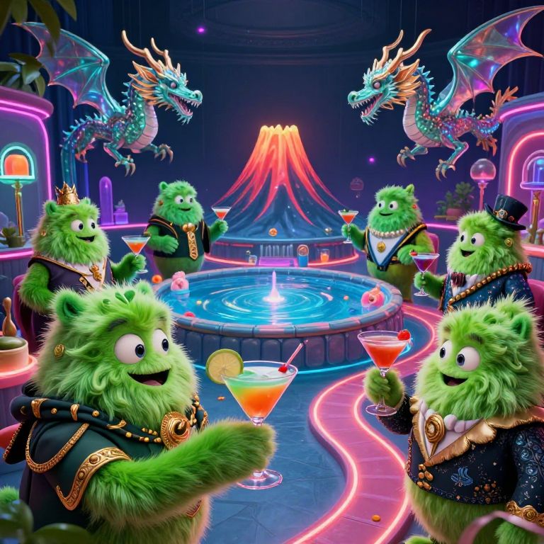 A surreal cocktail party with green, fuzzy monsters in ornate clothes, a pool with a volcano, glass dragons, and neon pathways.