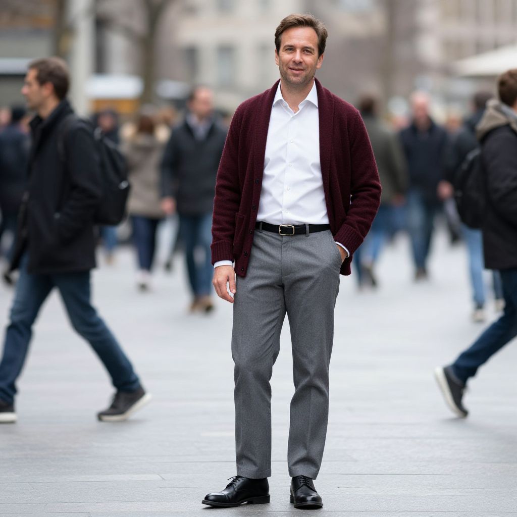 A man, white dress shirt, burgundy cashmere cardigan, grey chinos, black oxford shoes, black leather belt, bustling city square, disposable camera style, relaxed smile, candid moment. Man has masculine face and piercing eyes
