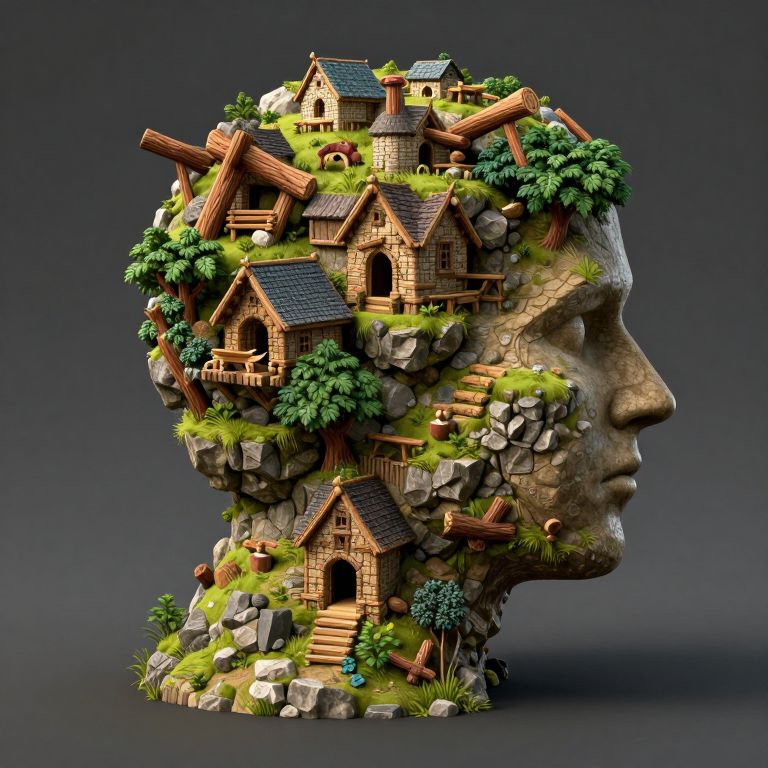 Photorealistic digital art of a human head profile transformed into a whimsical village, with wooden houses, greenery, and rocks, set against a