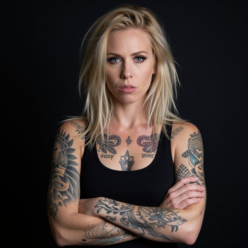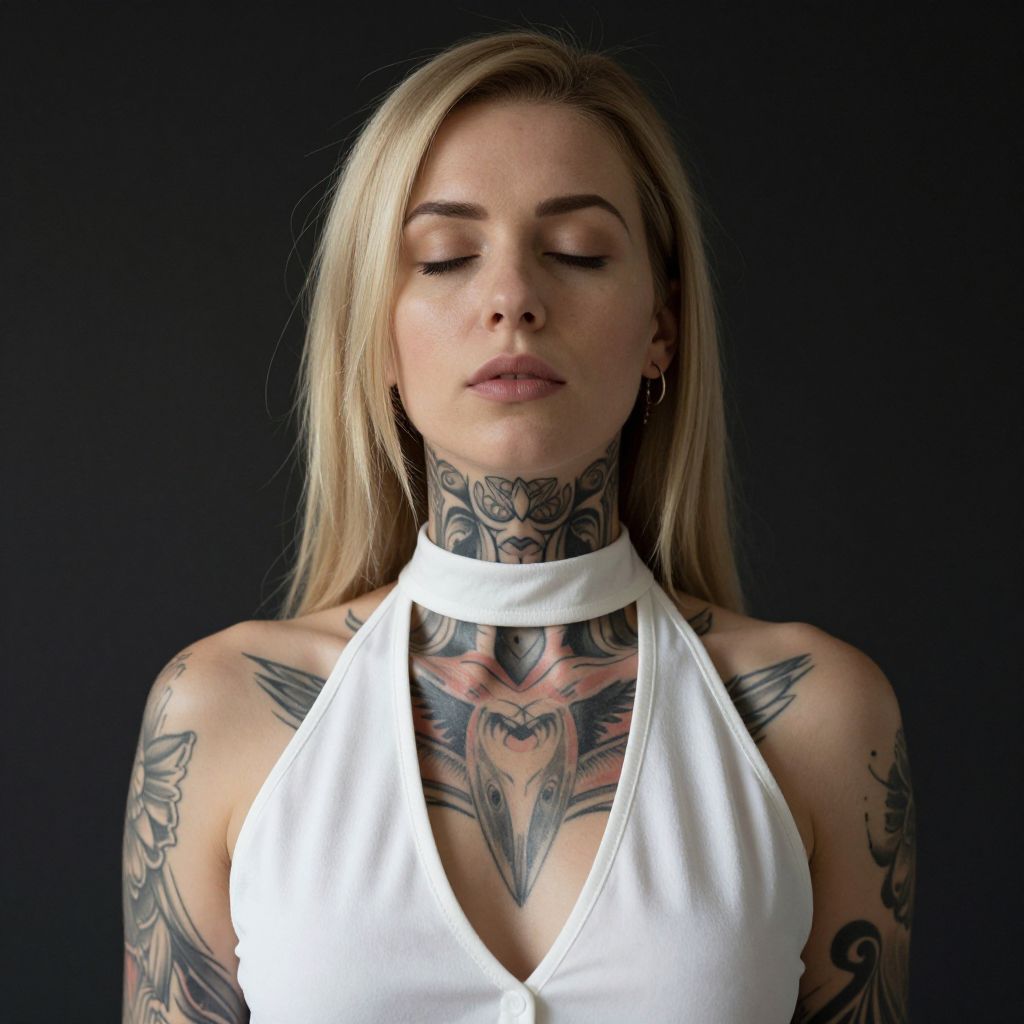 Photograph of a blonde woman with light skin and heavy tattoos on her neck and arms. She's wearing a white, slightly open, high-collared top and has her eyes closed, with a serene expression. Her hair is straight and parted to the side. The background is dark, making her light-colored top and tattoos stand out. She's wearing small hoop earrings. The lighting highlights her tattoos and facial features.