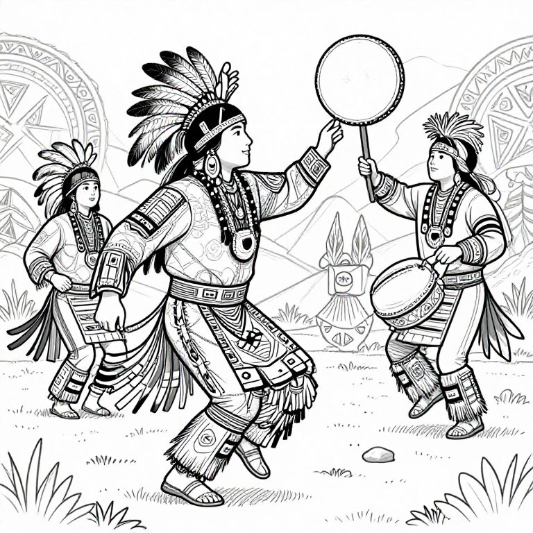 Pow wow coloring pages highlighting Native American dancers mid-performance, intricate feathered headdresses, traditional clothing, and ceremonial drums, set against a backdrop of geometric tribal motifs and nature-inspired elements for enriching and detailed coloring sessions.