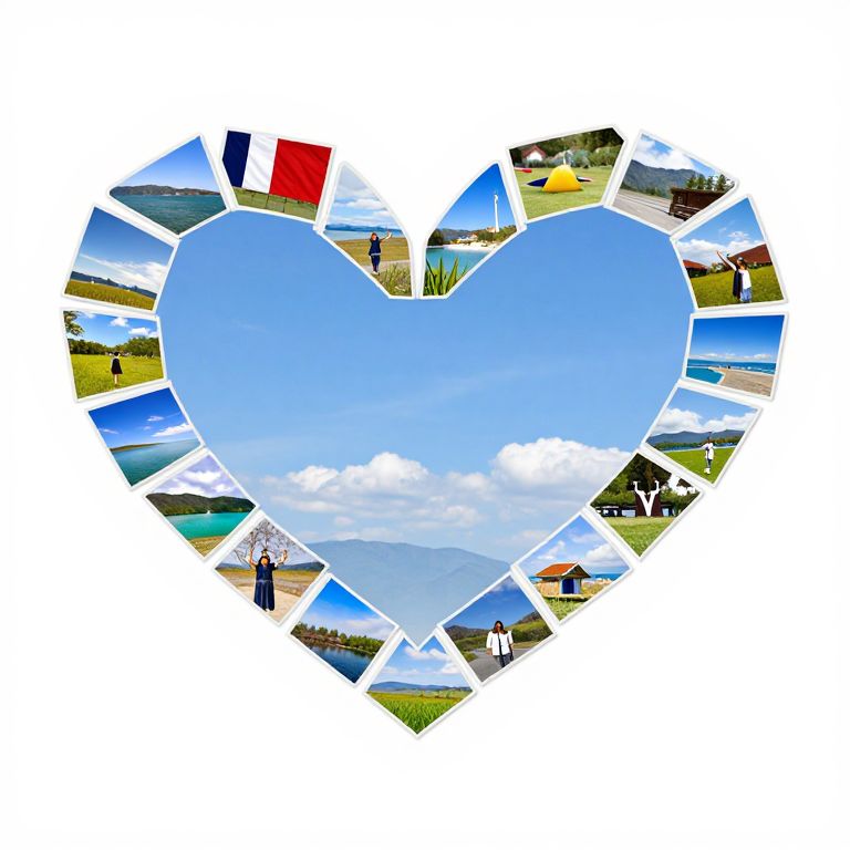 Photograph of a heart-shaped collage with a central blue sky and clouds, surrounded by diverse landscape and cultural photo segments.