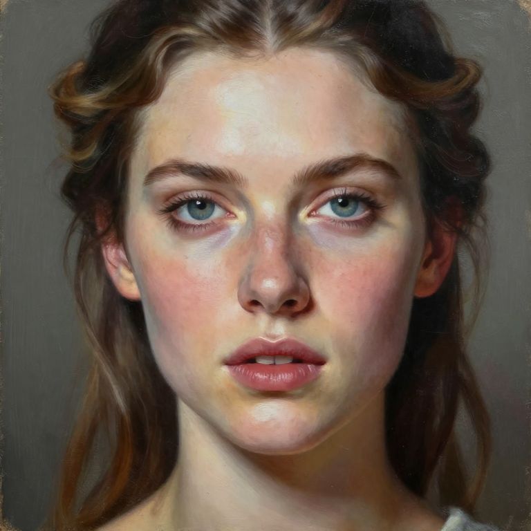 Hyper-realistic digital portrait of a young woman with fair skin, blue eyes, brown hair, and freckles, looking directly at the camera.