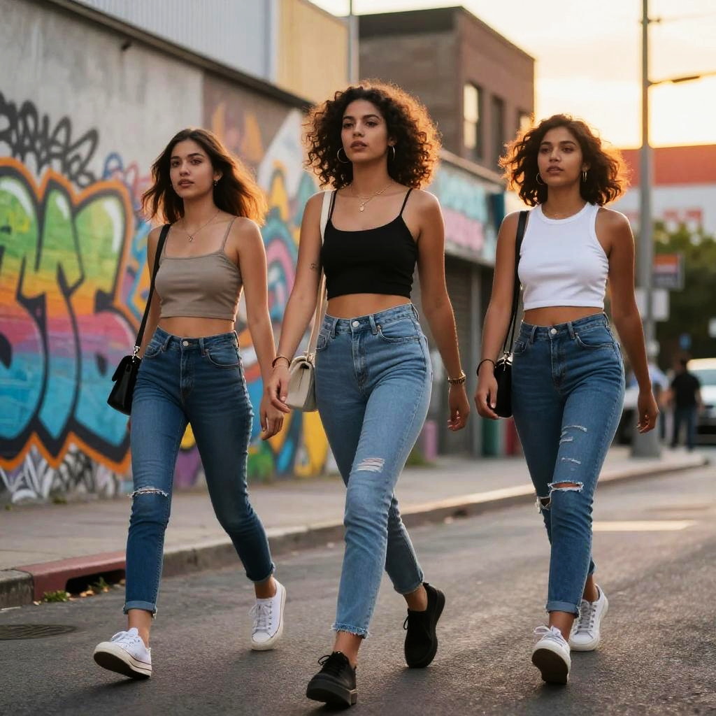 GTA bikini duo walking through downtown, stylish urban fashion, dusk lighting with street lamps, cinematic atmosphere, highly detailed characters and vibrant city environment