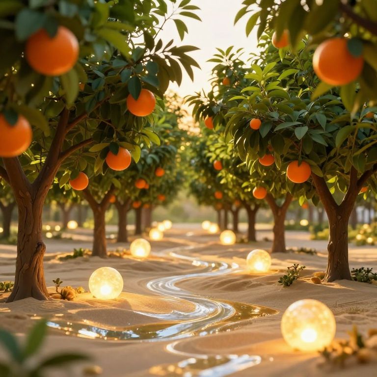 Photograph of a sunlit orange grove at sunset. Rows of orange trees with bright, orange fruits hang from green, leafy branches. A winding, reflective stream runs through the sandy ground, illuminated by glowing, spherical lanterns scattered along the path. The warm, golden sunlight filters through the trees, casting long shadows and creating a serene, magical atmosphere. The background features a soft, blurred horizon, enhancing the grove's depth and tranquility. The image combines natural beauty with a touch of enchantment, highlighting the grove's serene and picturesque qualities.