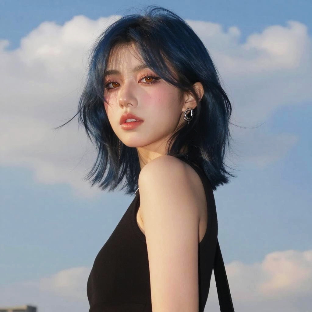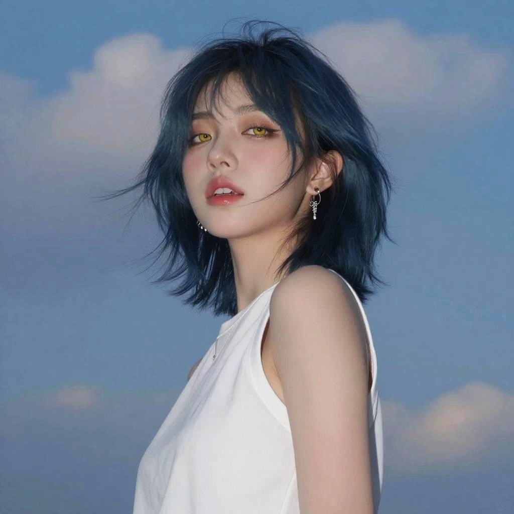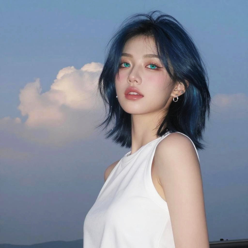 1girl, solo, shoulder-length hair, earrings, jewelry, looking at viewer, hazel eyes, cloud, upper body, outdoors, clear sky, sleeveless, blue hair, parted lips, shirt, from side, ligne claire, breasts, blush, open mouth, twilight, evening