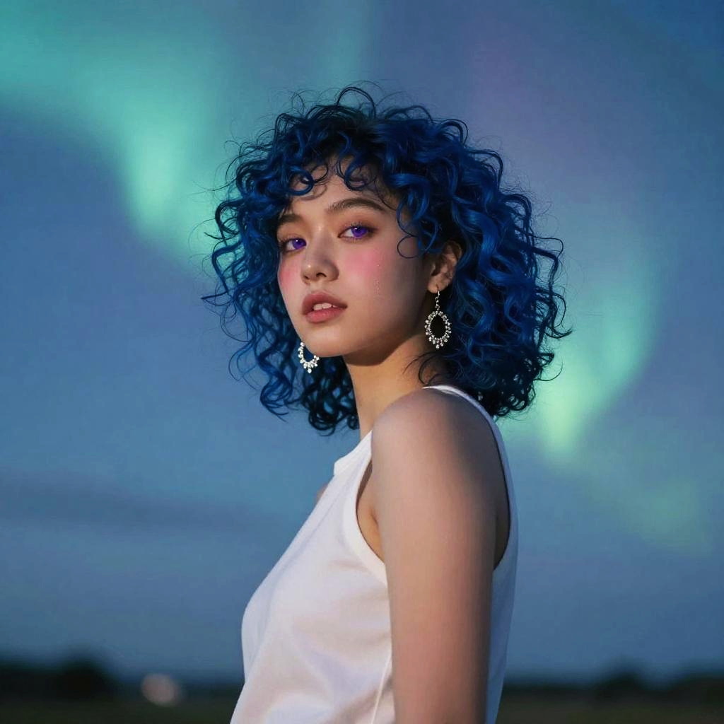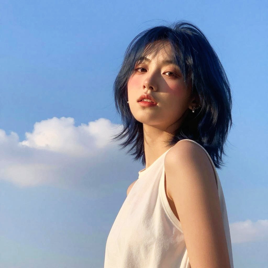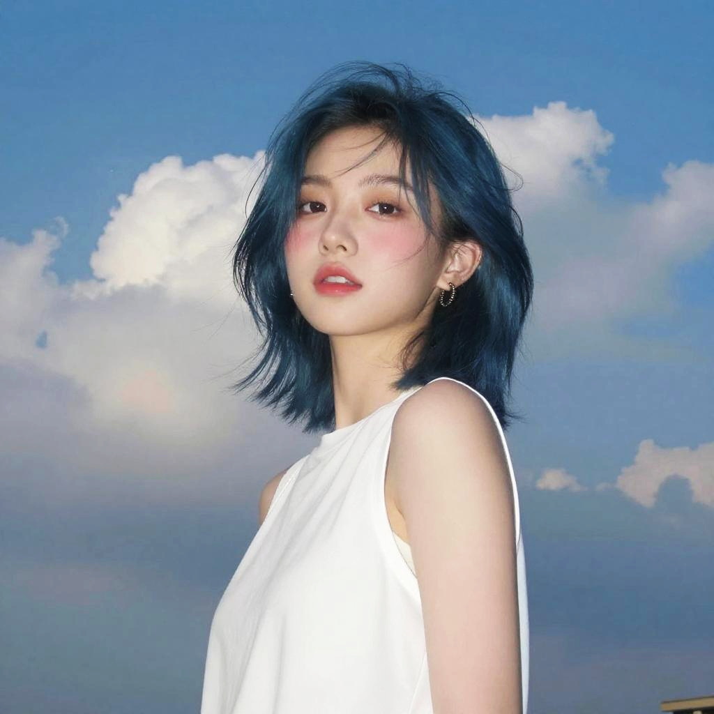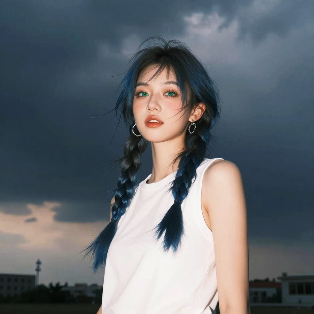 1girl, solo, shoulder-length hair, earrings, jewelry, looking at viewer, hazel eyes, cloud, upper body, outdoors, clear sky, sleeveless, blue hair, parted lips, shirt, from side, ligne claire, breasts, blush, open mouth, twilight, evening