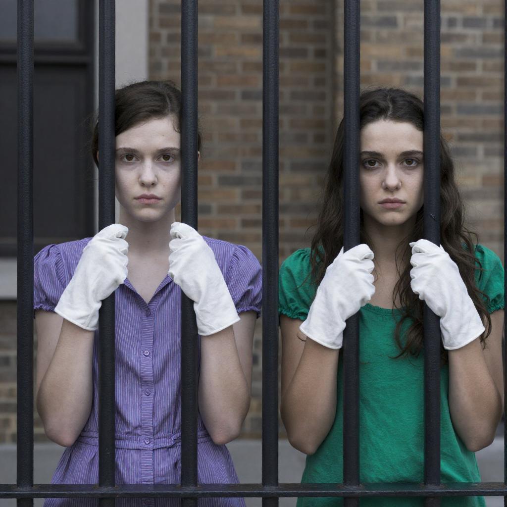 Black-and-white photograph of a young woman with light skin and dark, wavy hair, looking intently to the right. She is framed by vertical metal bars, creating a prison-like effect. Her expression is serious and focused. The background is blurred, emphasizing her face. The image has a high-contrast, dramatic lighting style.