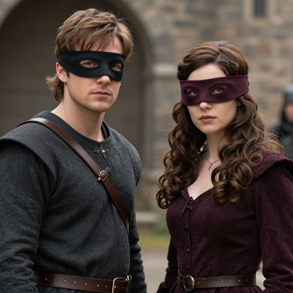 Photograph of a man and woman standing side by side, both wearing black masks that cover their eyes. The man has light brown hair, a fair complexion, and is dressed in a dark gray, textured long-sleeve shirt with a brown leather strap across his body. The woman has long, wavy brown hair, fair skin, and is wearing a deep purple, long-sleeve dress with a belt. Both have serious expressions. The background shows a stone building with an arched doorway, slightly blurred. The image has a cinematic, slightly dramatic style.