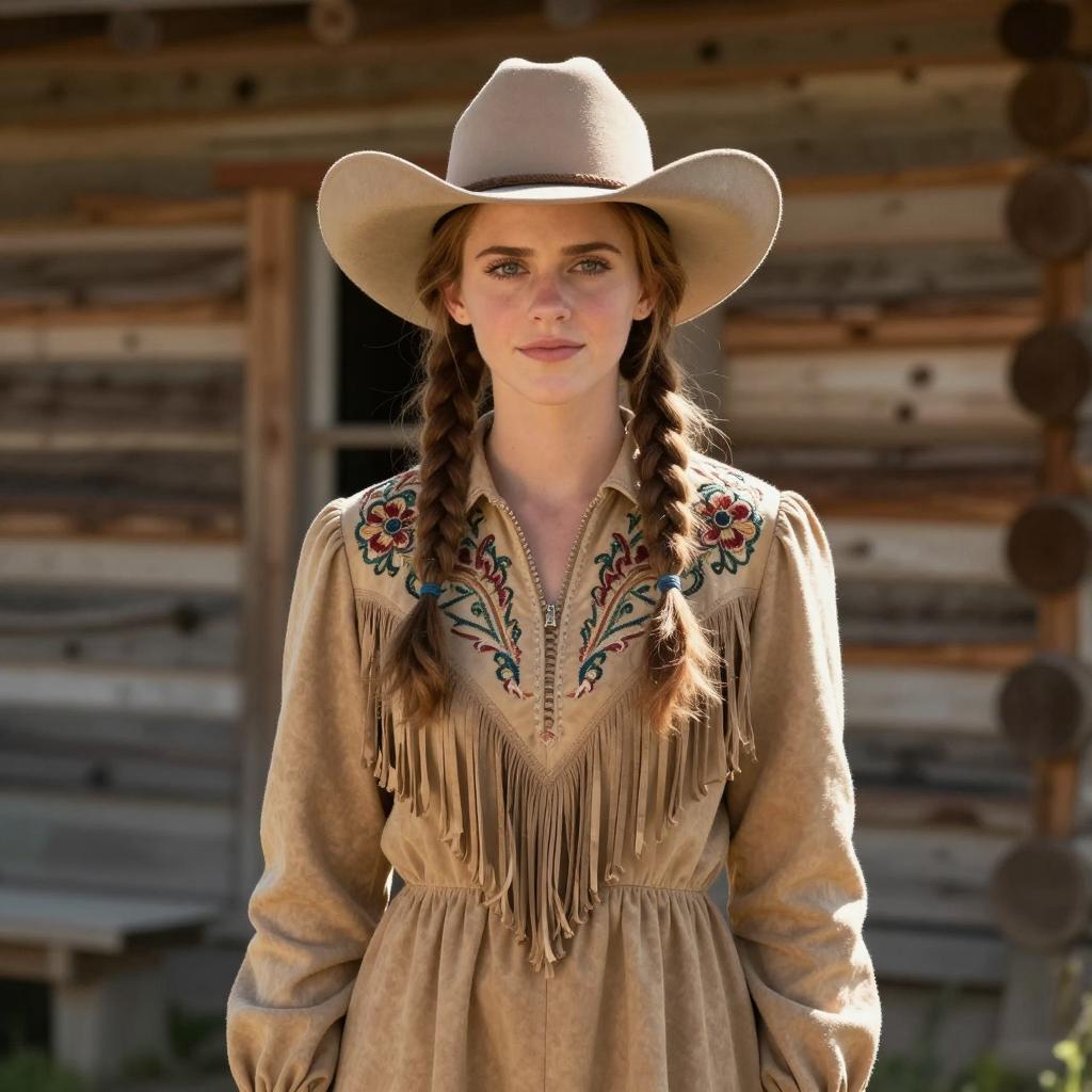 Photorealistic image of a young woman with long brown hair wearing a brown cowboy hat, cream short-sleeved blouse with intricate brown lace details, a brown leather belt with a large silver buckle, and a red patterned sash. She is accessorized with a necklace featuring a blue pendant. The woman is standing in front of wooden buildings in an old western town setting, under soft sunlight, creating a warm and calm atmosphere with a film-like aesthetic.