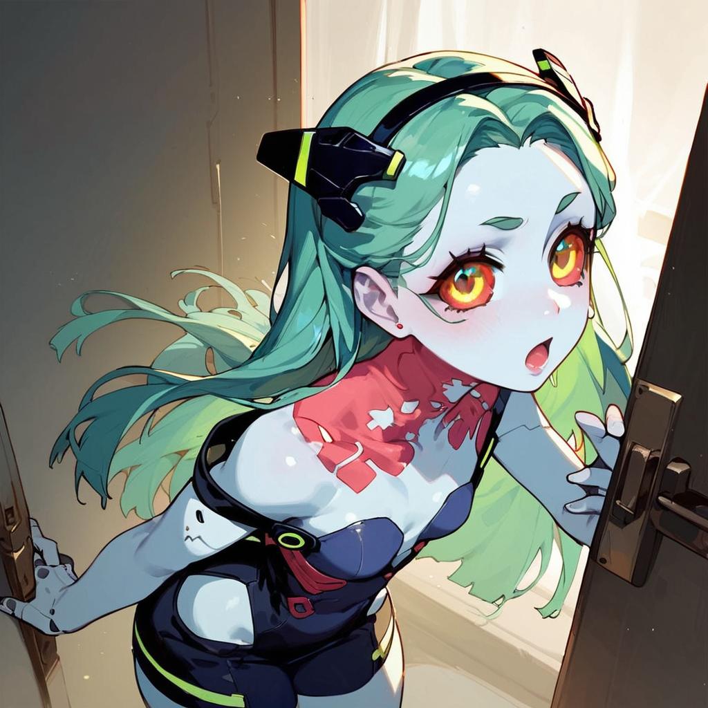 Score_9, score_8_up, score_7_up, source_anime, solo, 1girl, surprised, expressionless, open_mouth, :o, rebecca_(cyberpunk), (colored_skin:1.2), pale_skin, blue_skin, tattoo, colored_sclera, artificial eye, single_bare_shoulder, white_shirt, long_shirt, small_breasts, opening_door, holding_gun, from_above