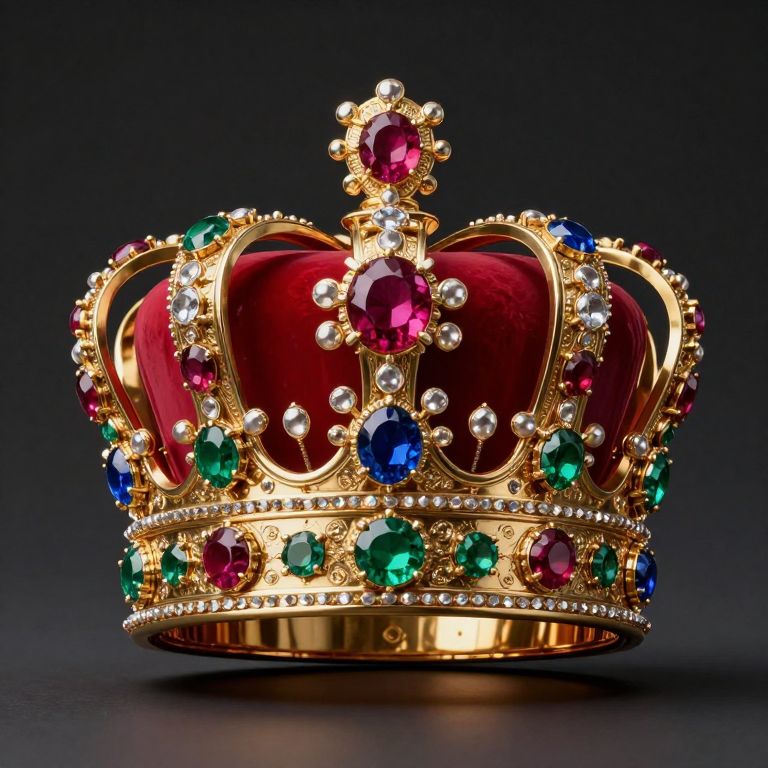 The image showcases a highly detailed, ultra-realistic crown, exuding an aura of regal opulence. Crafted with meticulous precision, the crown features an intricate design adorned with a myriad of precious jewels, including rubies, emeralds, and sapphires, each meticulously set in a golden framework. The crown's base is a rich, deep red, complemented by a gold band that encircles the top, adding to its grandeur. The crown's structure is composed of several interlocking elements, each meticulously sculpted and polished, creating a sense of depth and dimension. The jewels are not only set in the crown but also suspended from it, creating a dynamic interplay of light and shadow. The overall composition is symmetrical, with the jewels and the crown's structure arranged in a balanced, harmonious manner, emphasizing the crown's central position in the image. The background is a gradient of dark shades, which contrasts sharply with the crown, making it the focal point of the composition. The crown's detailed textures, from the smooth, polished surfaces of the gold to the faceted brilliance of the jewels, are rendered with hyperrealistic precision, capturing the viewer's attention and conveying a sense of luxury and power.