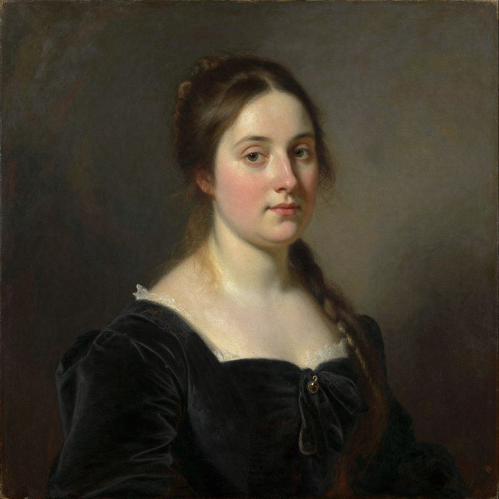Classical oil painting of a young white woman with light skin, brown hair in a braid, wearing a black velvet dress, against a dark background