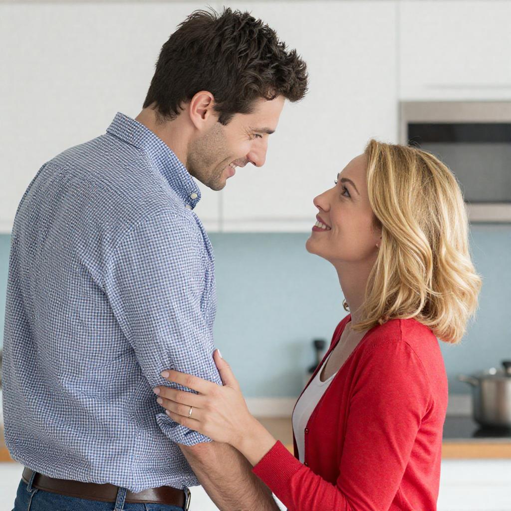 Photograph of a man and woman cooking in a kitchen. Man with short brown hair, black shirt, white apron, chopping vegetables. Woman with blonde hair, blue long-sleeve shirt, colorful floral apron, looking at man, holding frying pan with vegetables. Green wall, wooden door, framed landscape painting in background.