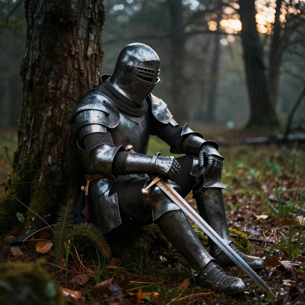 Sad knight leaning on a rusted sword near a quiet forest clearing during twilight, rain softly falling, his armor scratched and dented, eyes downcast as he contemplates past battles, rich natural tones blending with a somber atmosphere.
