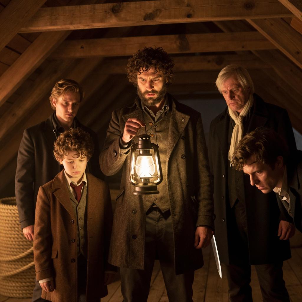 Five people in a dimly lit, wooden attic. Central man with curly hair, beard, holding lantern, looking concerned. Young boy with curly hair, brown coat, looking down. Older man with white hair, black coat, white scarf, holding knife, looking down. Younger man with brown hair, brown coat, leaning forward. Large rope coil on left. Warm, yellow light.