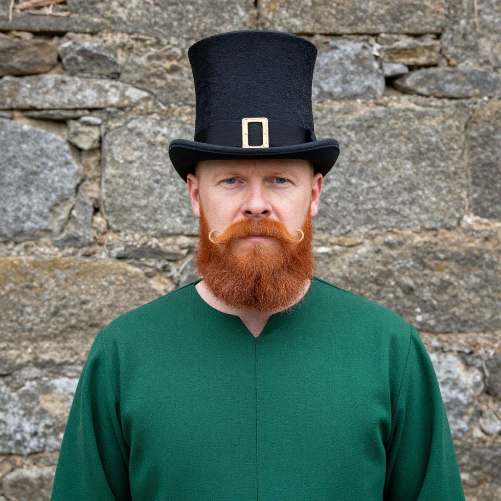 A man with a striking red beard and curled mustache is dressed in a traditional green outfit, featuring a top hat with a gold buckle, standing against a rustic stone wall. The styled flat cap and rich textures in this portrait evoke a vintage, Celtic-inspired fashion aesthetic.