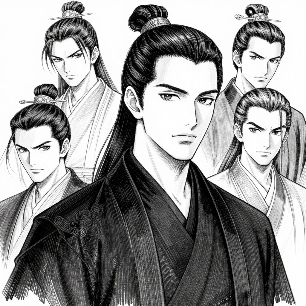Portrait of clean - shaven man with pony - tail hair up wearing black robes, pen and ink, intricate line drawings, by craig mullins, ruan jia, kentaro miura, greg rutkowski, loundraw