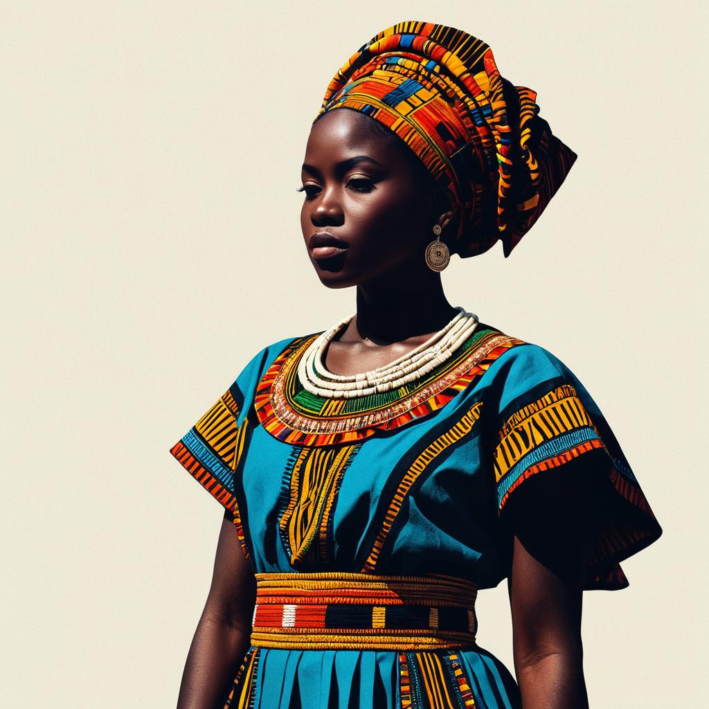 Flat illustration of a woman in African traditional dress, in simple shapes, vibrant colors