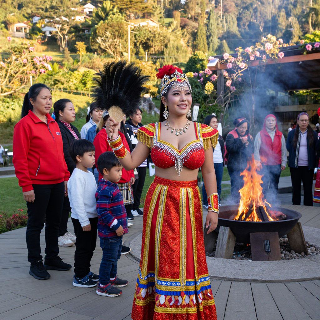 A community celebration scene in Baguio with several adults and children dressed in authentic ethnic costumes, one woman prominently wearing a red and gold Baguio costume with intricate beadwork and a feathered fan, the setting is a wooden platform surrounded by flowering trees and fire pit under golden sunlight.. The woman has big tits and cute face