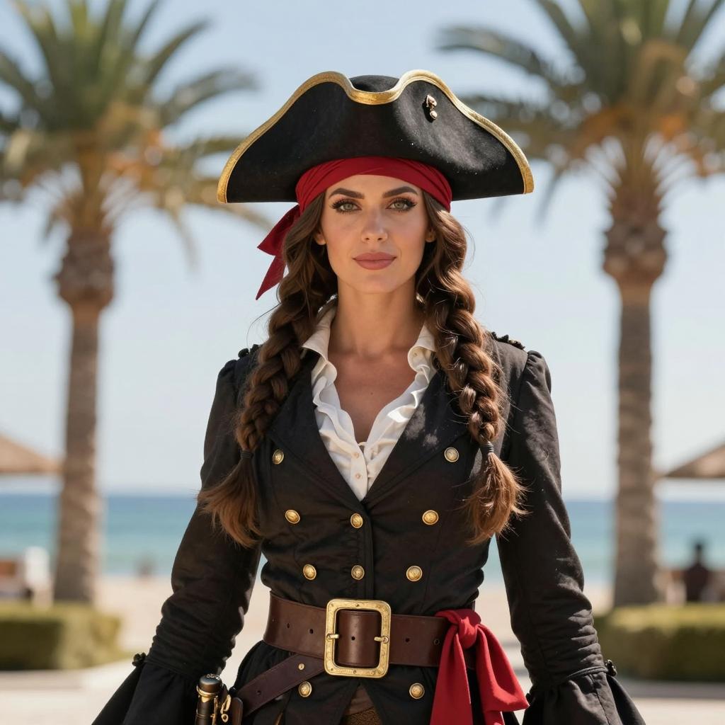 Portrait of a slim, curvaceous woman dressed as a pirate, standing on a tropical beach. She wears a black pirate hat with a skull emblem, a red headscarf, a white low-cut blouse underneath a tight brown leather corset, and matching shorts with a large belt. The subject has long black wavy hair, striking makeup, and an intense, stern expression with gritted teeth. The setting is a sunny tropical island beach with palm trees and blue ocean in the background.