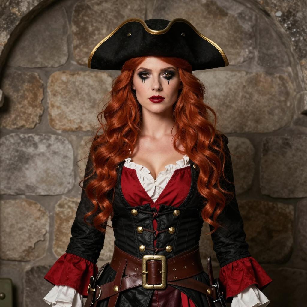 Fish-Eye slim curvaceous mature Femme fatale pirate, standing on a desert islands beach, clevage, angry and stern, elegant angry features, gritting teeth, slim highly detailed photo, 4k, dressed in a tight lowcut pirates outfit,