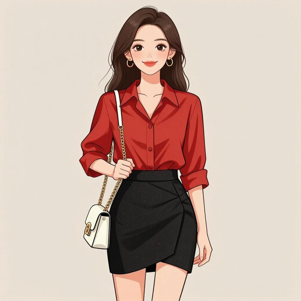 Woman with pretty face and pretty hair. smiling Woman, chic, red silk blouse with a collar and rolled-up sleeves, paired with a black textured mini skirt with an asymmetrical wrap design, holding a small white shoulder bag with a gold chain strap. --sref 1467