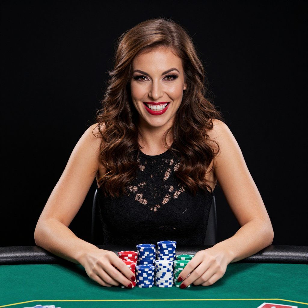 Photograph of a smiling woman with long, wavy brown hair, wearing a black lace sleeveless top, sitting at a green casino poker table. She's holding red, blue, white, and green poker chips with her hands resting on the table. The background is completely black, making her and the colorful chips stand out. She exudes confidence and excitement.