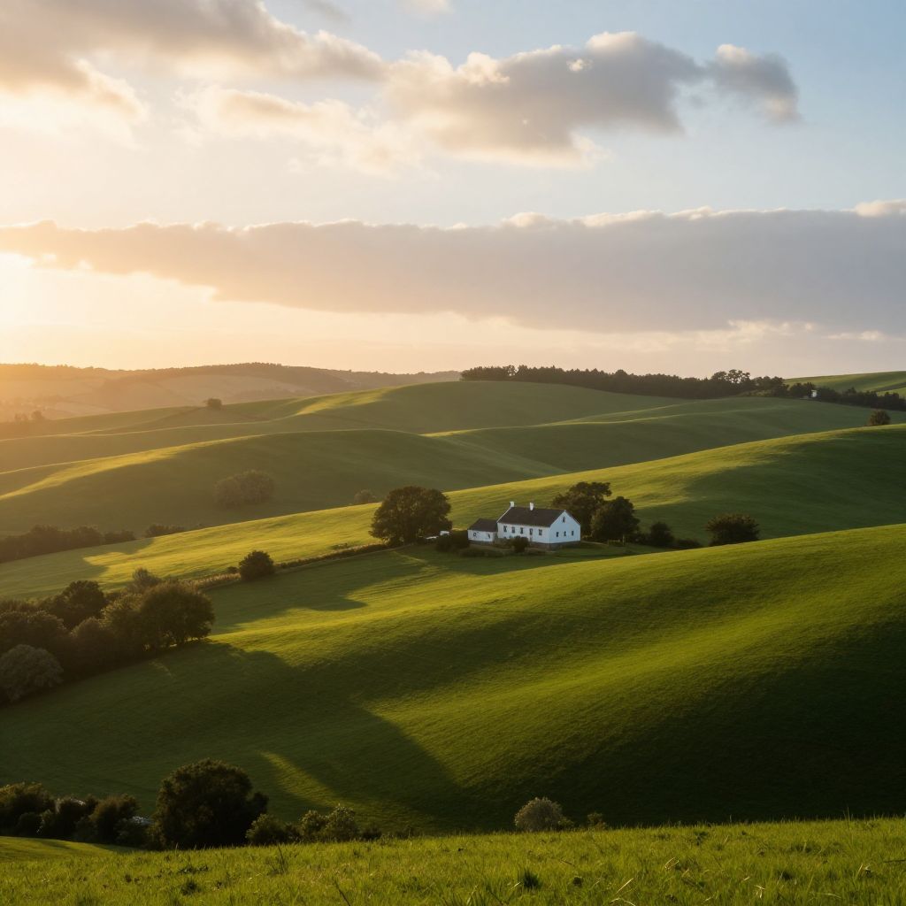 A picturesque landscape featuring rolling green hills bathed in the warm glow of a setting sun. A white farmhouse is nestled among trees and fields, surrounded by lush countryside with long shadows stretching across the terrain under a partly cloudy sky.