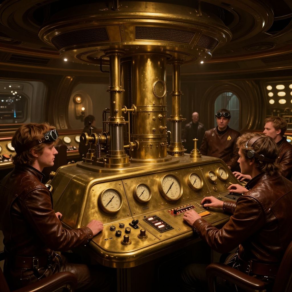 Steampunk Star Trek bridge with brass control panels, steam-powered engines, vintage dials and gauges, crews in leather and goggles, a fusion of futuristic and 19th-century industrial design