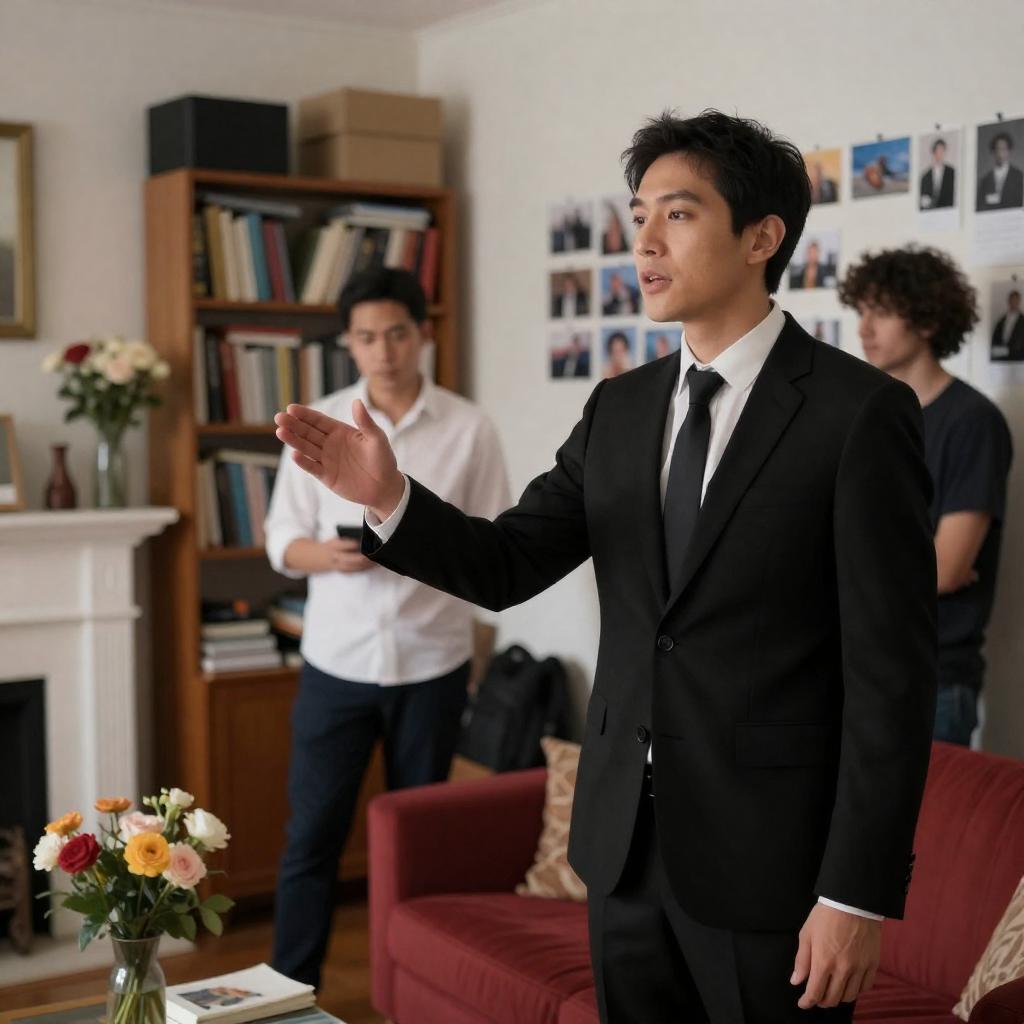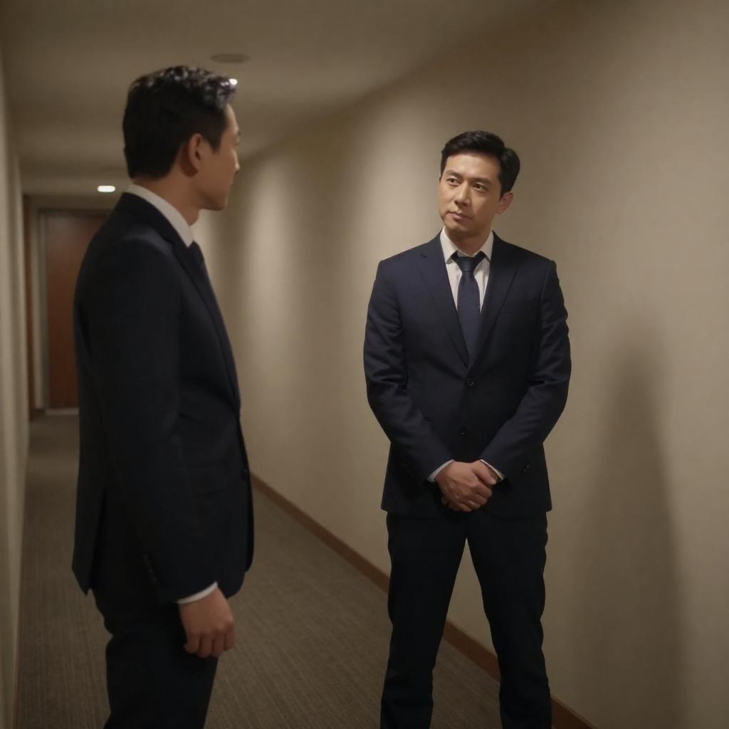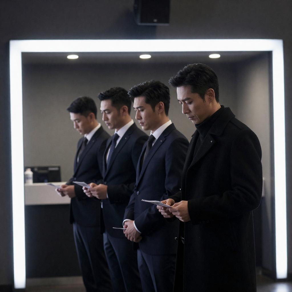 Two men in black suits standing side by side, intently reading papers. The man on the right has dark hair and a serious expression, while the man on the left has slightly wavy hair and a subtle smile. They stand indoors in front of a large black-and-white mural featuring close-up portraits of faces. The background includes a neutral wall and a row of circular lights.