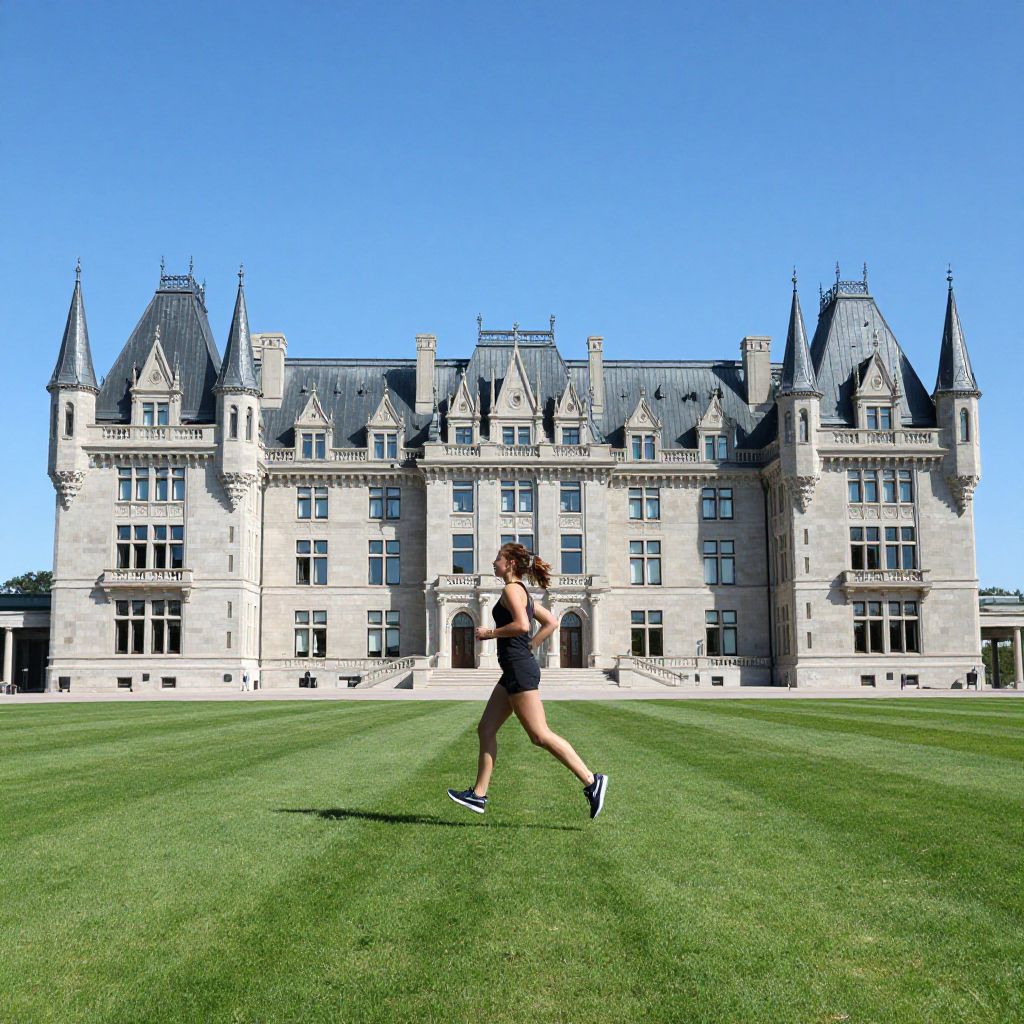 Photograph of a fit woman with curly hair in black sports bra and shorts, running on a manicured lawn in front of a grand, Gothic-style