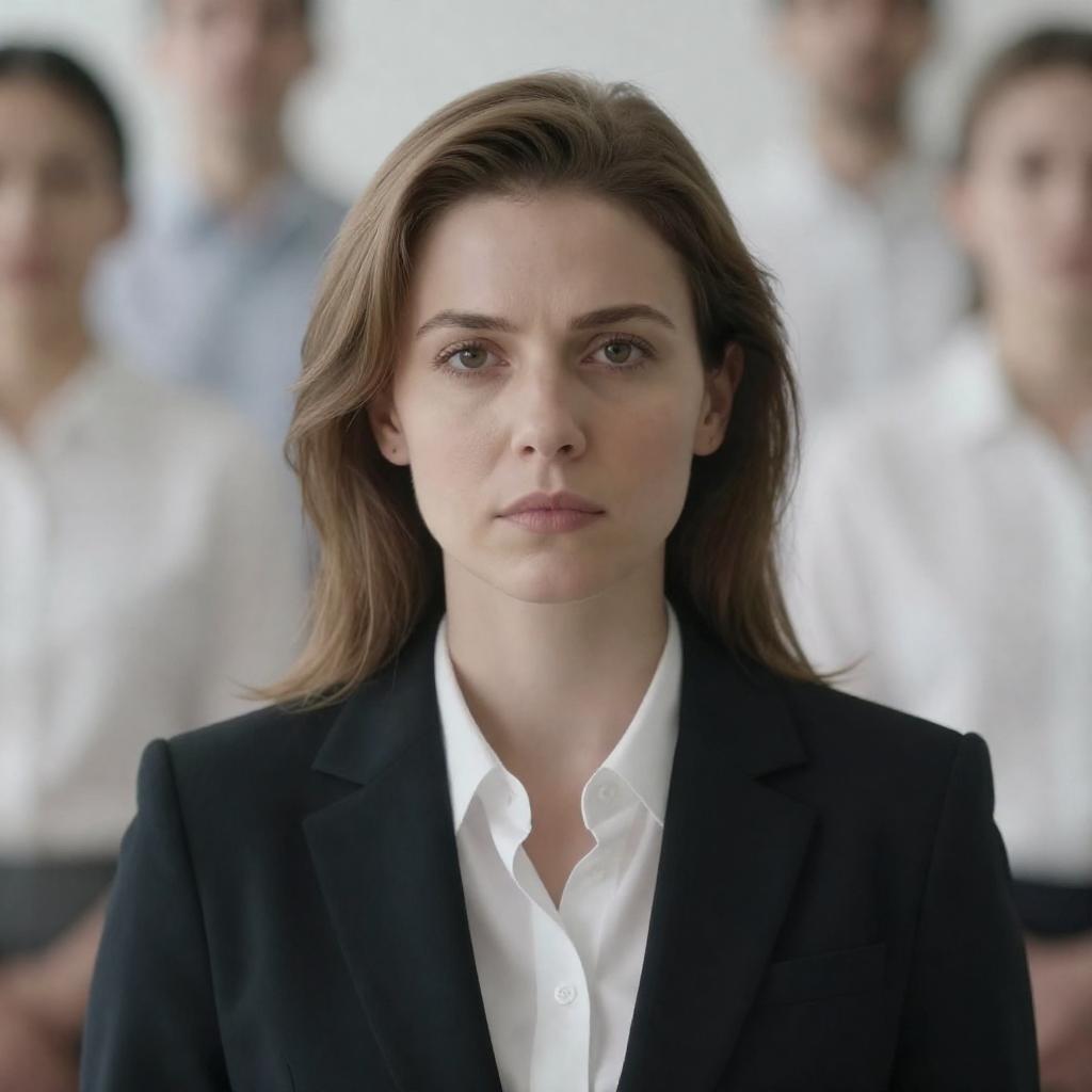 Photograph of four people standing outdoors, arms raised. Blonde woman in gray tank top and black pants center, serious expression. Bald man in brown shirt left, neutral expression. Man in red shirt middle, neutral expression. Woman in yellow shirt right, smiling. Stone building background. Bright daylight.
