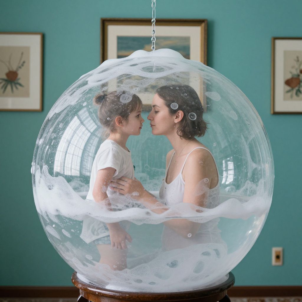 Two individuals, a woman and a child, stand inside a transparent, spherical soap bubble filled with frothy suds, their bodies partially submerged in soapy water, creating a surreal and intimate moment against a teal wall adorned with framed artwork and a small wooden door handle.