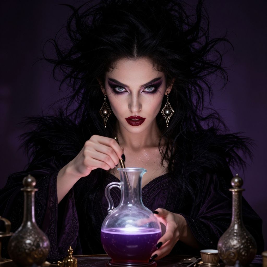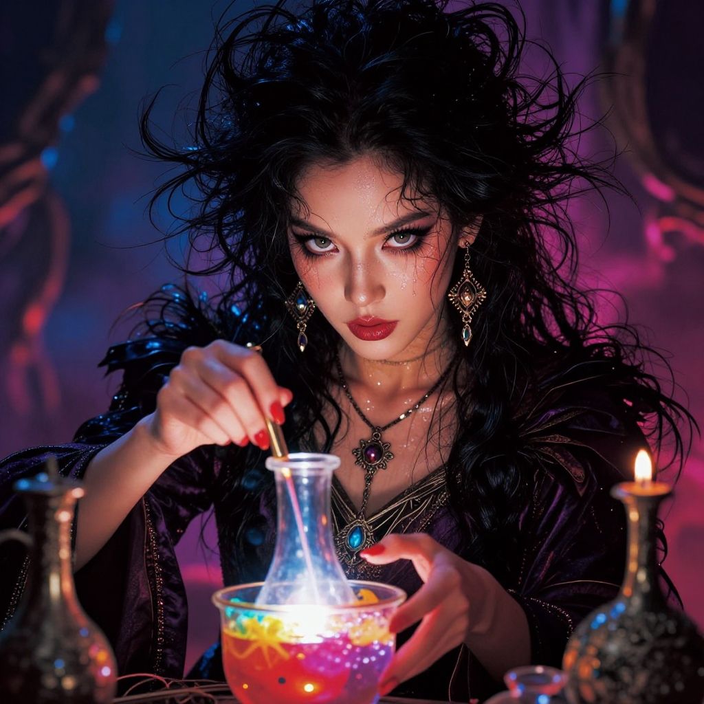 (masterpiece), (best quality), (ultra-detailed), best quality, masterpiece, ultra detailed, a dark witch making a potion, dark fantasy, medieval, illustration, disheveled hair, detailed eyes, perfect composition, moist skin, intricate details, earrings, by wlop, vivid colors, elegant, very inspirational, cute, beautiful, epic, color, highly saturated, illuminated, cinematic, light, dynamic, strong, dramatic, intricate, atmosphere, full background, inspired, colorful, magic, new, shiny, great composition, professional, artistic